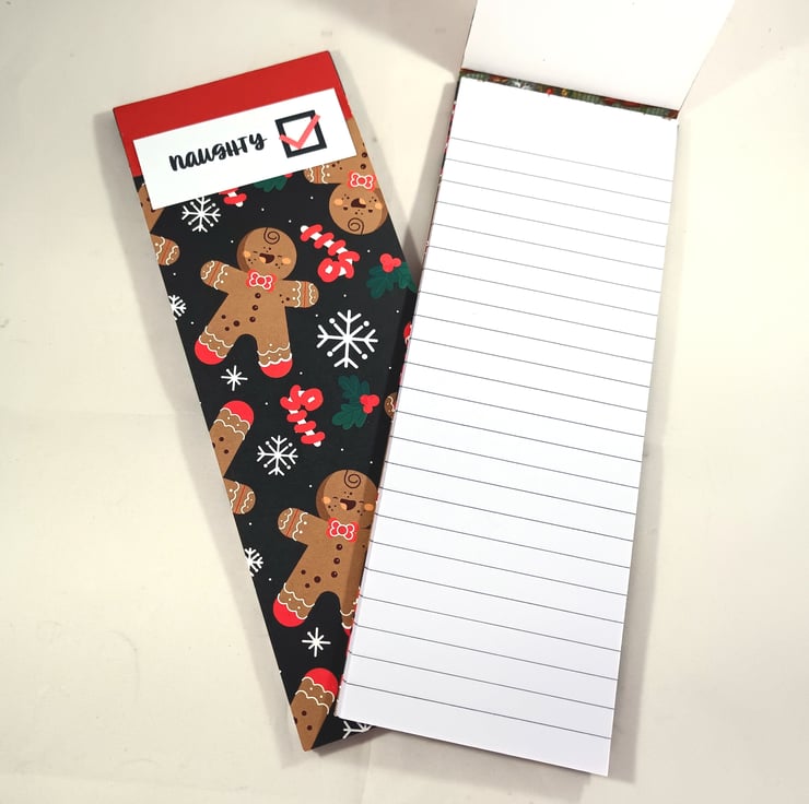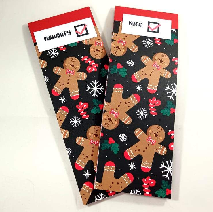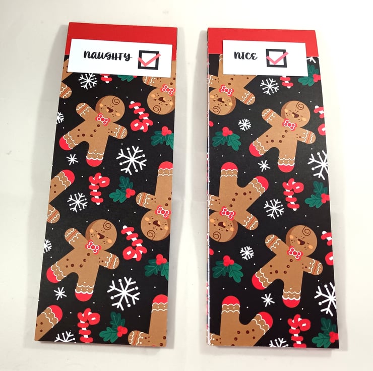 Pack of 2 slim, lined notepads. Each pad has approximately 30 sheets and has a hard board back, covered in gingerbread men patterned paper. One is Santa's naughty list and one his nice list. Ideal for Christmas shopping or for keeping tabs on behaviour throughout the year!