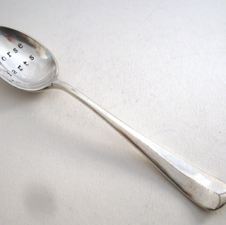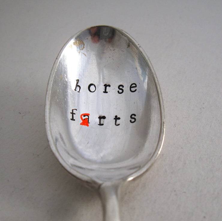 A very silly and slightly rude hand stamped vintage silver plated rattail style teaspoon with 'horse f-rts' stamped in the bowl. Because why not. Sometimes a bit of childish humour is just what you need to get through the day! Perfect if you've drawn someone you can't stand in the office Secret Santa... doubly perfect if that person also rides...