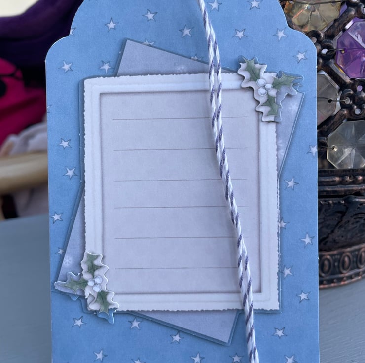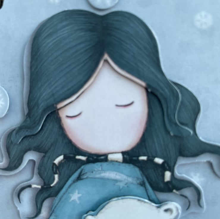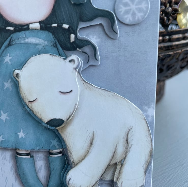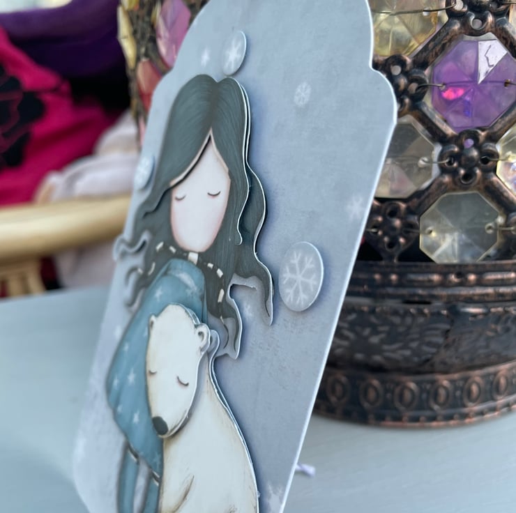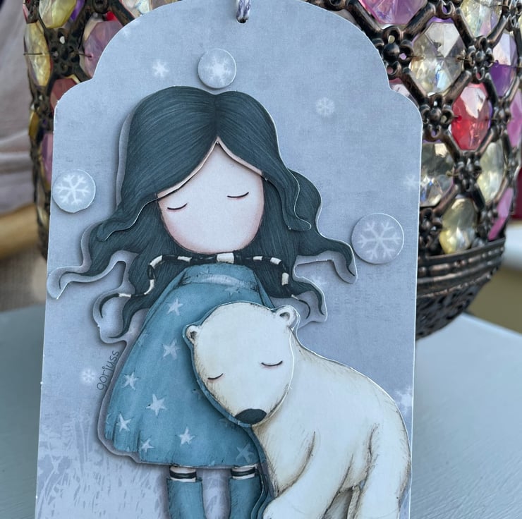 A cute Gorjuss girl gift tag to send to someone special. This 14x9cm gift tag features a gorjuss girl dressed in a blue dress with a cute polar bear. These are decoupaged to give dimention. The back had a panel to write your greeting. This can be used for christmas or a winter birthday.