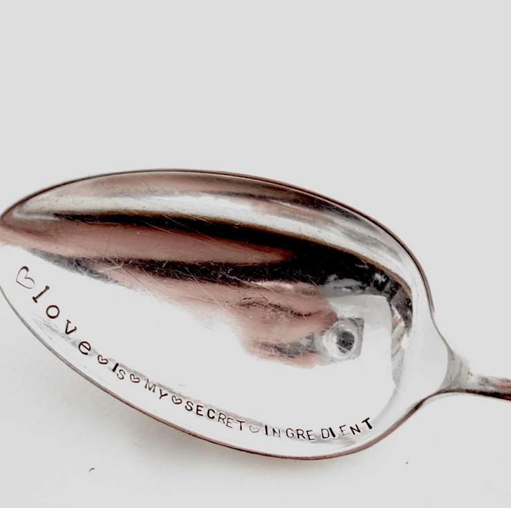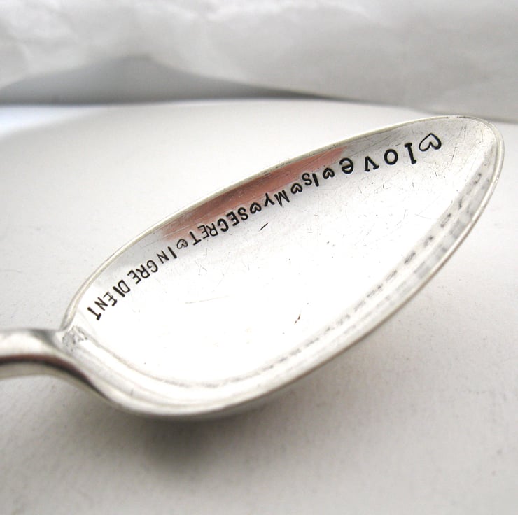 A hand stamped vintage silver plated dessertspoon with the words 'love IS MY SECRET INGREDIENT' along one edge, with little hearts on either side of the words. It's a nice solid spoon measuring approximately 7" (17.5cm) long and has an 'old english' handle with the engraved initials R.C.