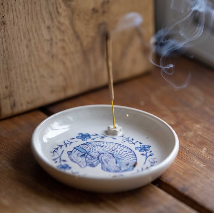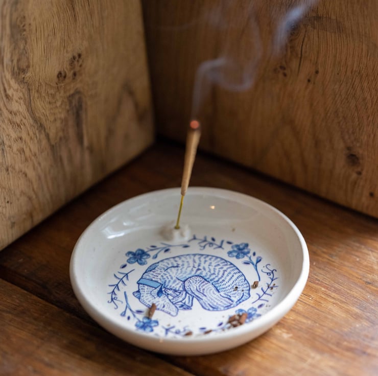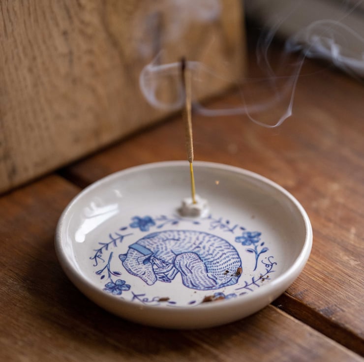 These lovely dishes are approx 2cm high and 12cm in diameter. They can be functional in a variety of ways but are designed to hold an incense stick and catch the ashes.