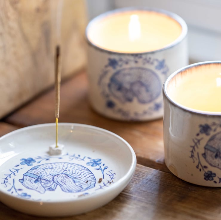 Thrown on the potters wheel in strong white stoneware and finished by hand with a flower addition to hold an incense stick.