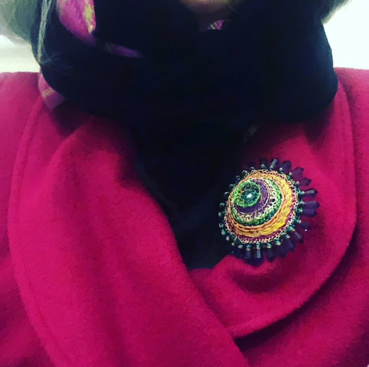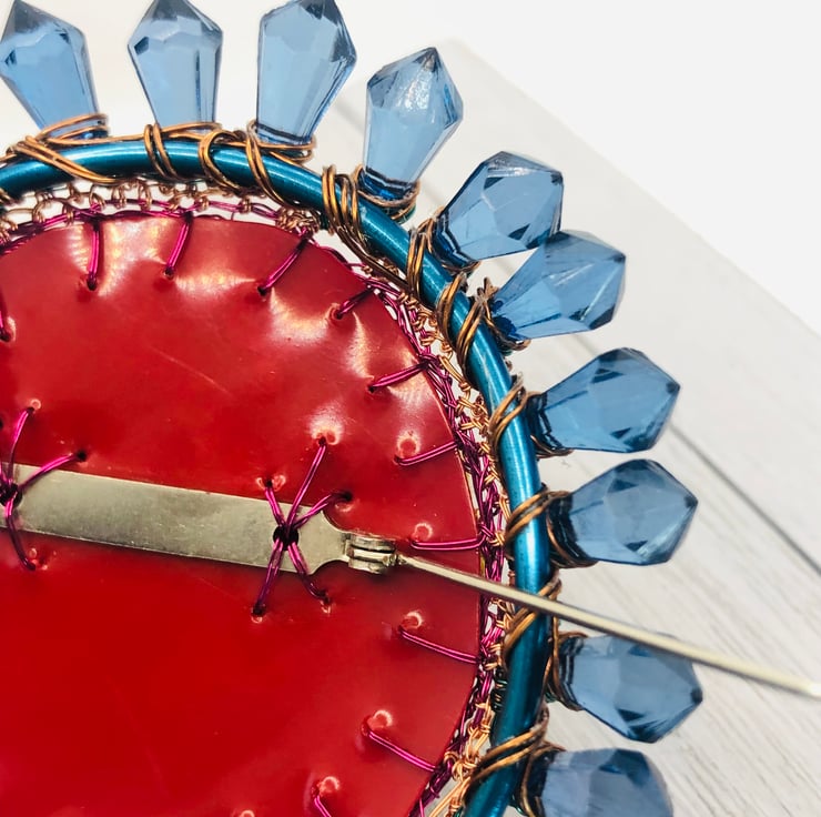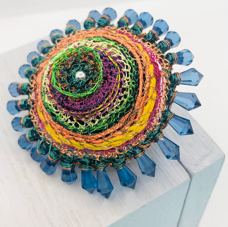 Domed (Kandinsky lockdown) Brooch (Rainbow) with added vintage bead edge - from new and repurposed, recycled and adapted materials. Looks fabulous on tweed, wool, a knitted scarf or hat. I use wire reclaimed from old televisions, plastic ribbon, bought wire, vintage yellow string from my Grandmother. The backing is red plastic repurposed from a conditioner tube.