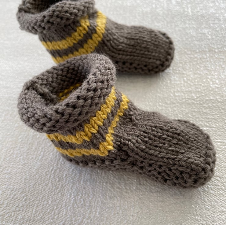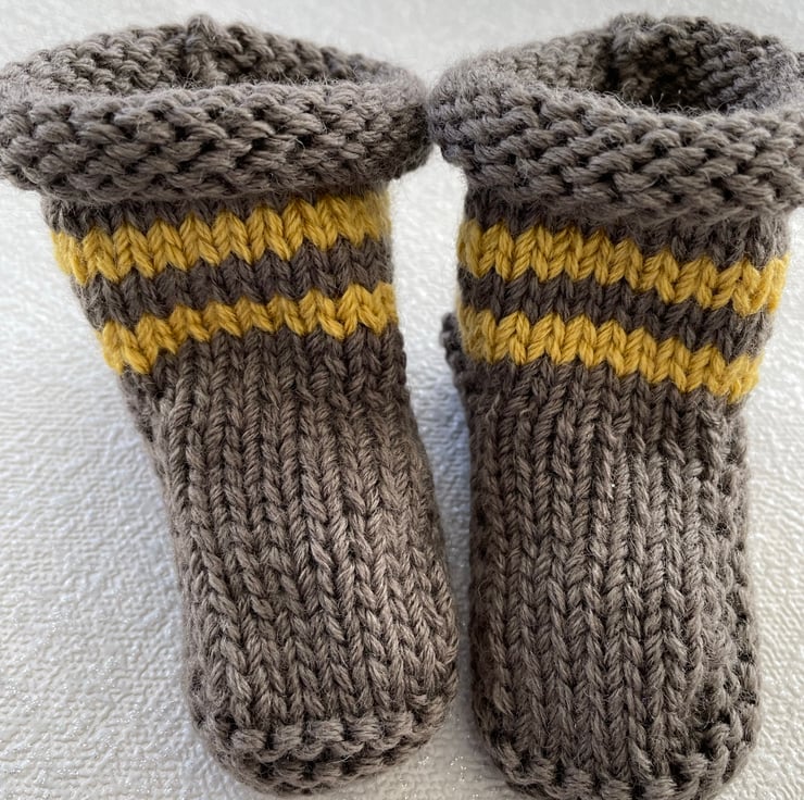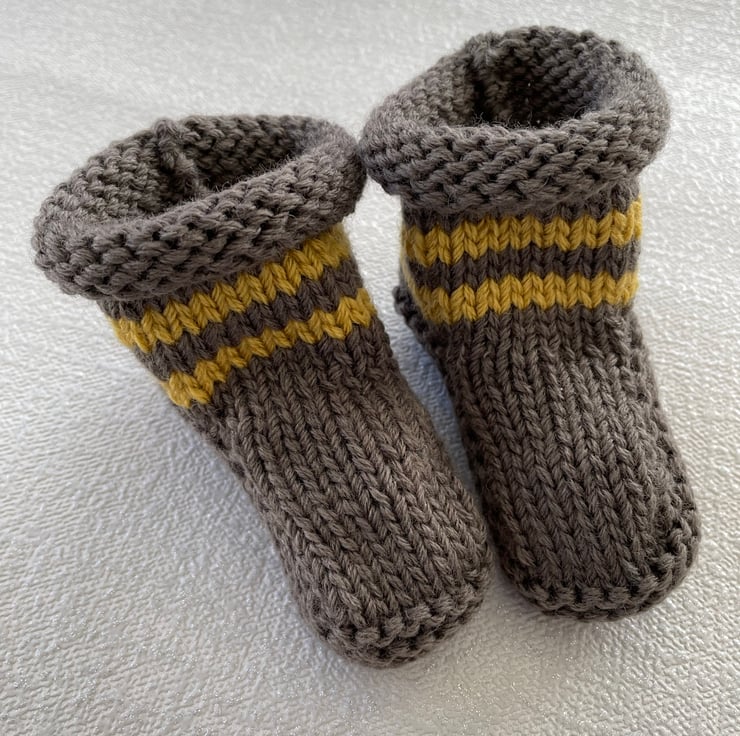 A hand knitted pair of bootees worked in an aran weight yarn. The background is worked in brown and they have mustard stripes. The bootees have a roll top, two stripes on the leg and a stripe round the sole.