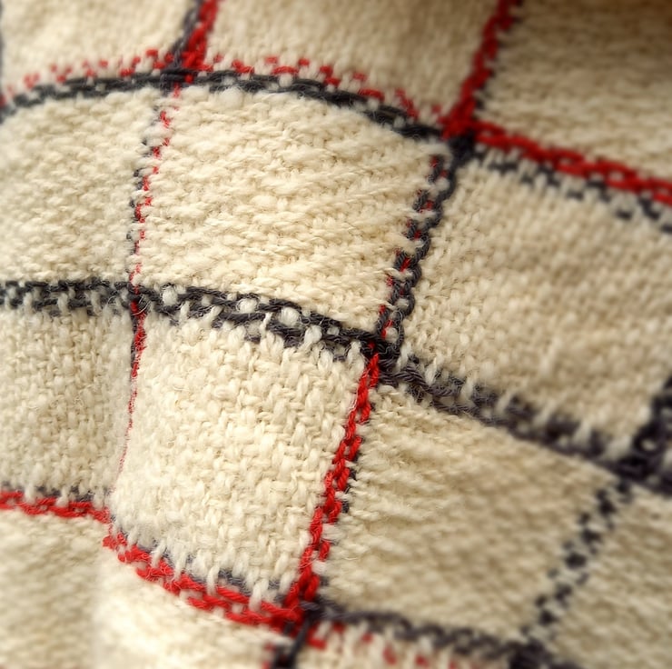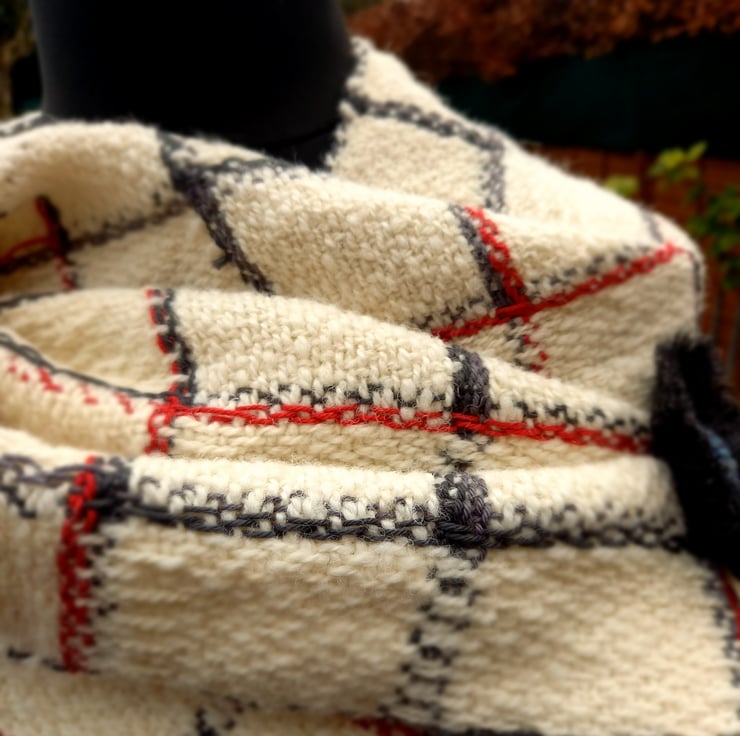 In beautiful handspun shetland wool with hints of colour from cotton outlines. This gorgeous blanket shawl will keep you cosy and warm this winter.
