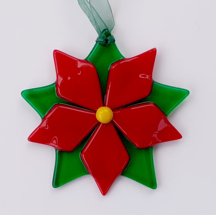 Handmade fused glass poinsettia Christmas decoration. Created from bright green transparent glass and red opaque glass with a little yellow nugget at the centre. Drilled and strung with a green organza ribbon, ready for hanging. Size approx 8cm, excluding ribbon, but some variation in glass colour and size will occur as each one is made individually.