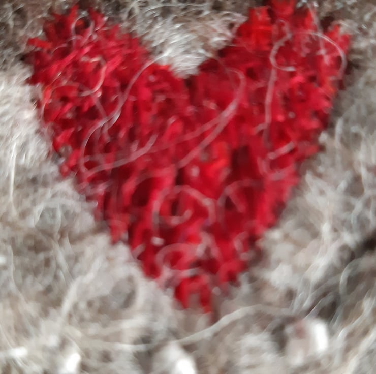 I made this robust felt pouch in natural shades of fleece round a template. Its lovely texture was set off by the hand dyed cochineal red in the strap and heart embroidery. Finishing touches came with the silk French knots and horn button.