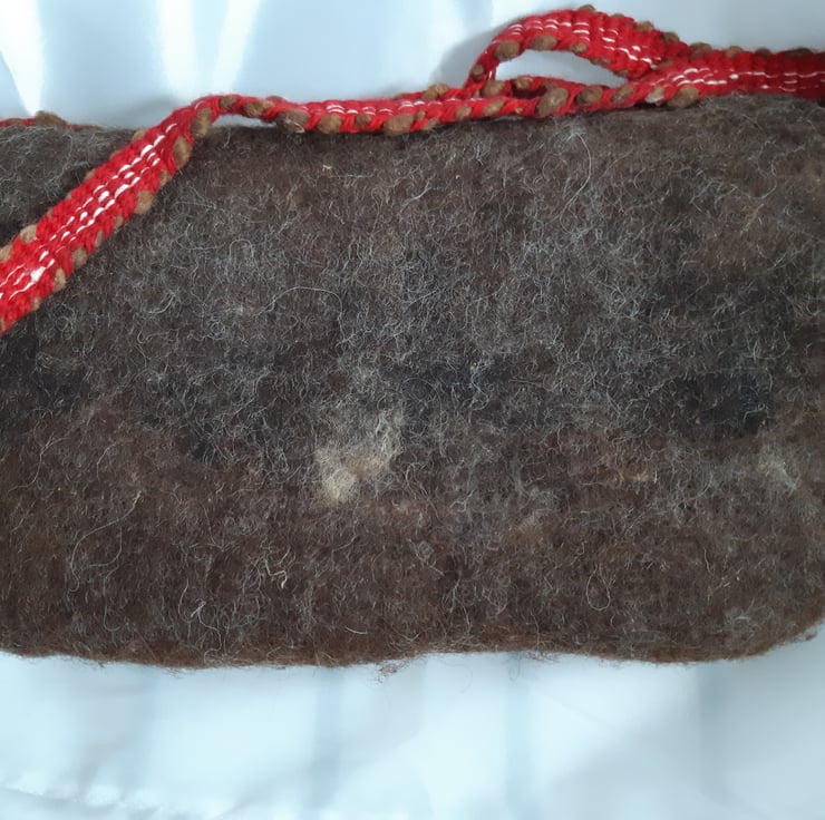 All wool felt simple pochette with handwoven strap made from cochineal dyed yarn. Embroidery in cochineal dyed wool thread and silk. Horn button and woven tab closure. It is ca 12 inches wide, 7 inches long and 1 inch deep.
