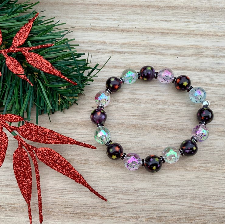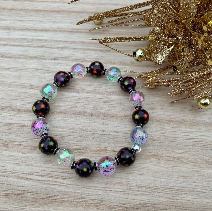 Super sparkles with this eye catching handmade bracelet, using clear beads with iridescent glitter effect and acrylic black beads with multi coloured beads and silver and black rondelles, made on super string stretch elastic cord for durability. Will fit up to an 8 inch wrist and a 7/7.5 inch wrist for a relaxed fit.