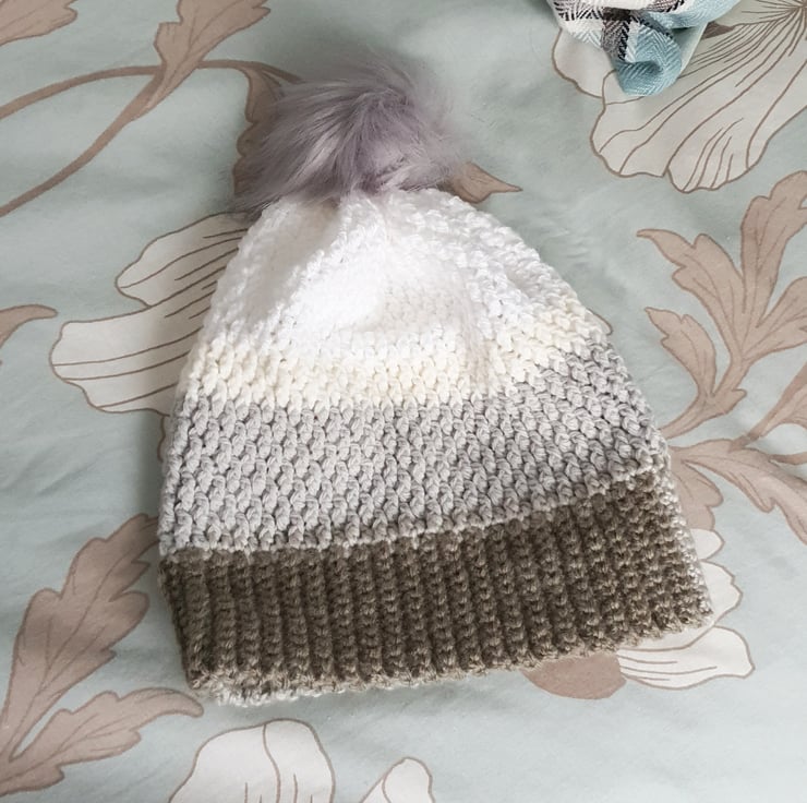 This has a faux fur detachable pompom so it can be removed for washing. Fixed with a loop to an internal button.