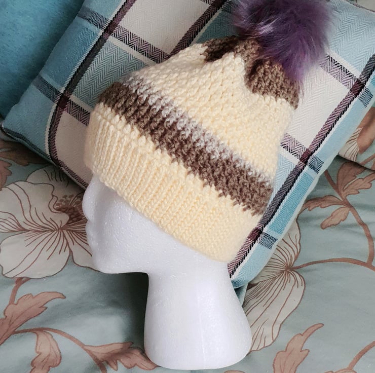 This has a faux fur detachable pompom so it can be removed for washing. Fixed with a press stud.