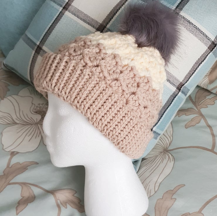 This has a faux fur detachable pompom so it can be removed for washing. Fixed with a press stud.