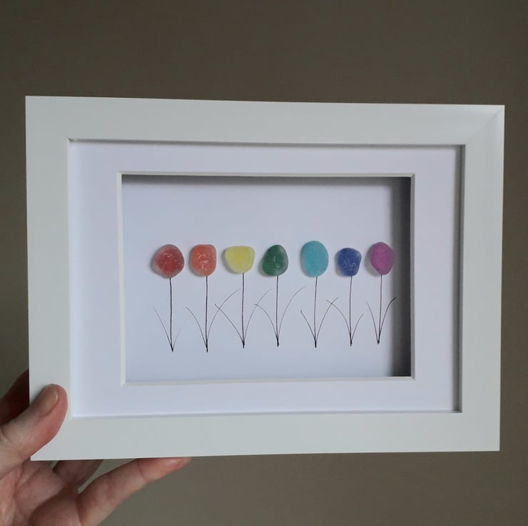 Pretty picture of Sea Glass Rainbow Flowers. The sea glass is hand coloured to match the colours of a rainbow. This made to order artwork is mounted on white card in a high quality white contemporary frame with a high shine to the glass (15 x 20 cm)