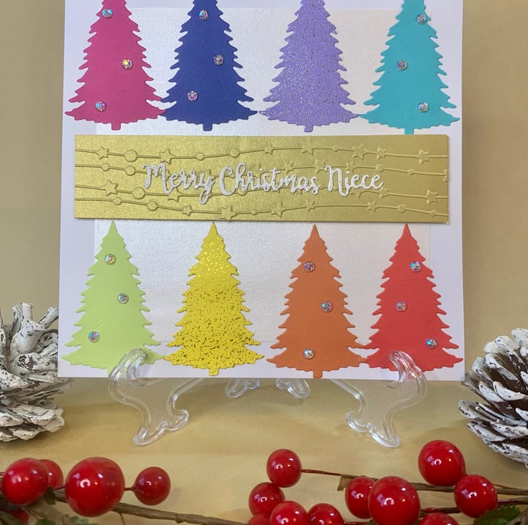 Made using die cutting and embossing techniques, the sentiment is set on a festive embossed background and surrounded by 8 different coloured trees, each with a little sparkle on them.