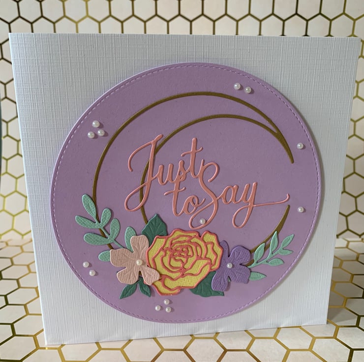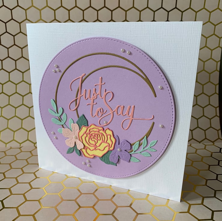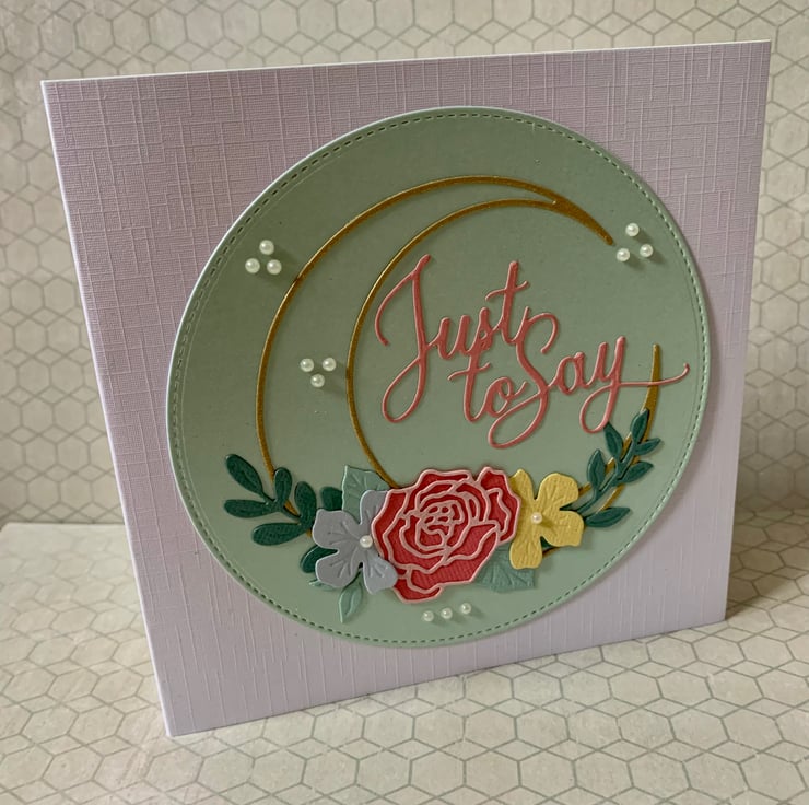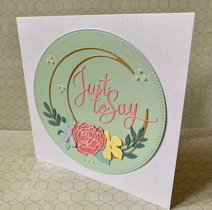 This is a pretty handmade ‘Just To Say’ card made with an intricate floral wreath set on a pastel coloured circle, with pearl effect embellishment. Choose from one of 2 colours.