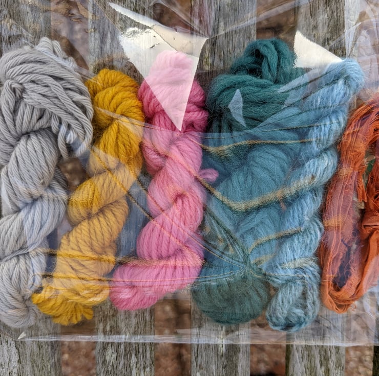 Various yarns and fibres in lovely colour combinations, to create the weft, which include a mixture of materials from the following