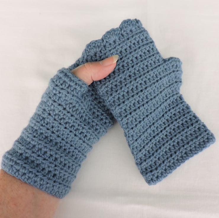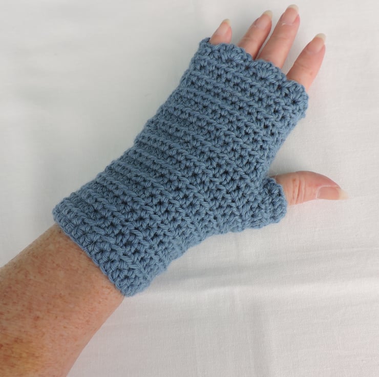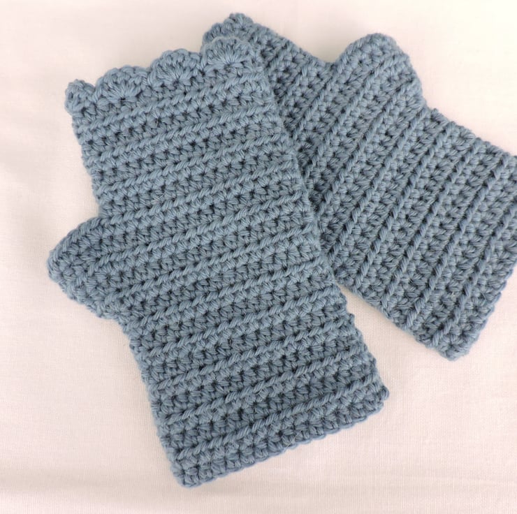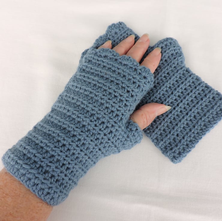 Sale These adults crocheted fingerless mitts have been made using a beautifully soft aran weight alpaca and acrylic yarn. The colour is a lovely light air force blue. These mitts have a plain body finishing with a wave edge top. Soft and warm, ideal for the colder weather.