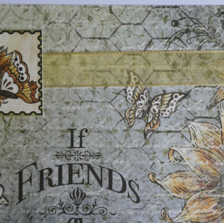 The message is printed onto a background paper with a collage design of sunflowers and butterflies in autumnal yellows, pale blue and greens.
