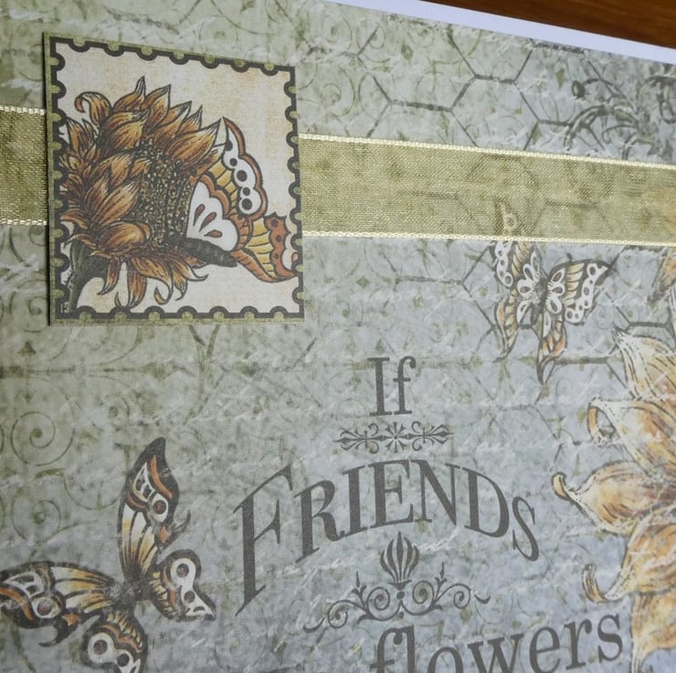 A yellow organza ribbon has been wrapped around the top of the background paper and then a stamp style image of a sunflower with a butterfly has been added.