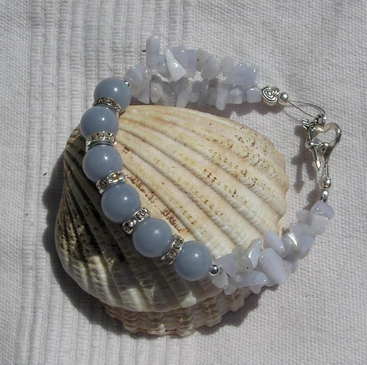 This Stunning Bracelet is made from Pale Blue Angelite round beads alternated with Glistening Crystal studded spacers finished by double-stranded Blue Lace Agate Gem-Stone Chips with a tiny Silver Heart at each end – A touch of elegance that will look stunning either worn casually or with something more Elegant for a Special Evening out