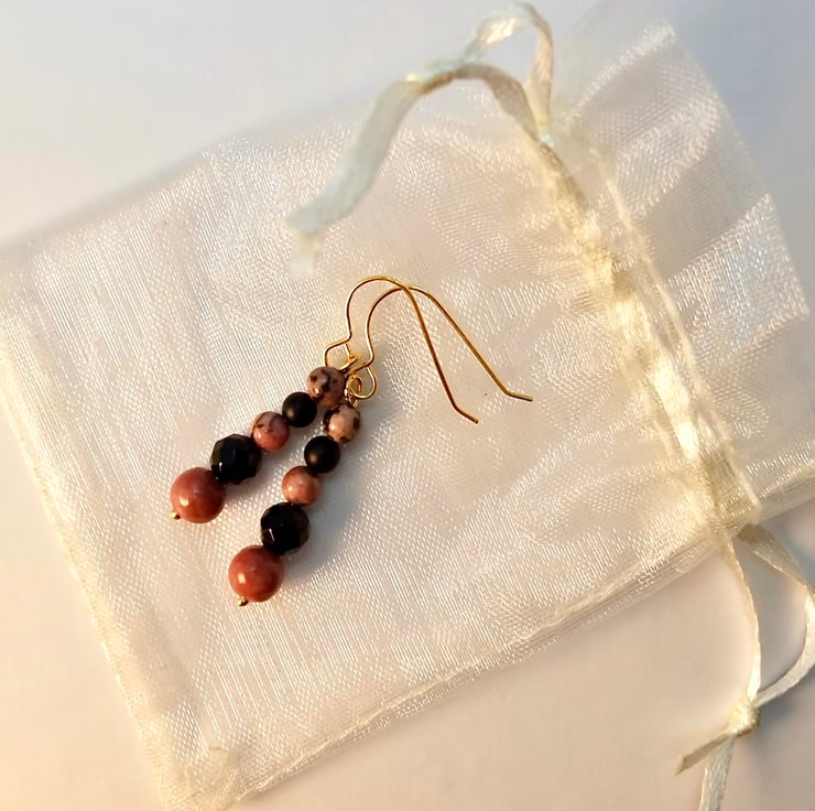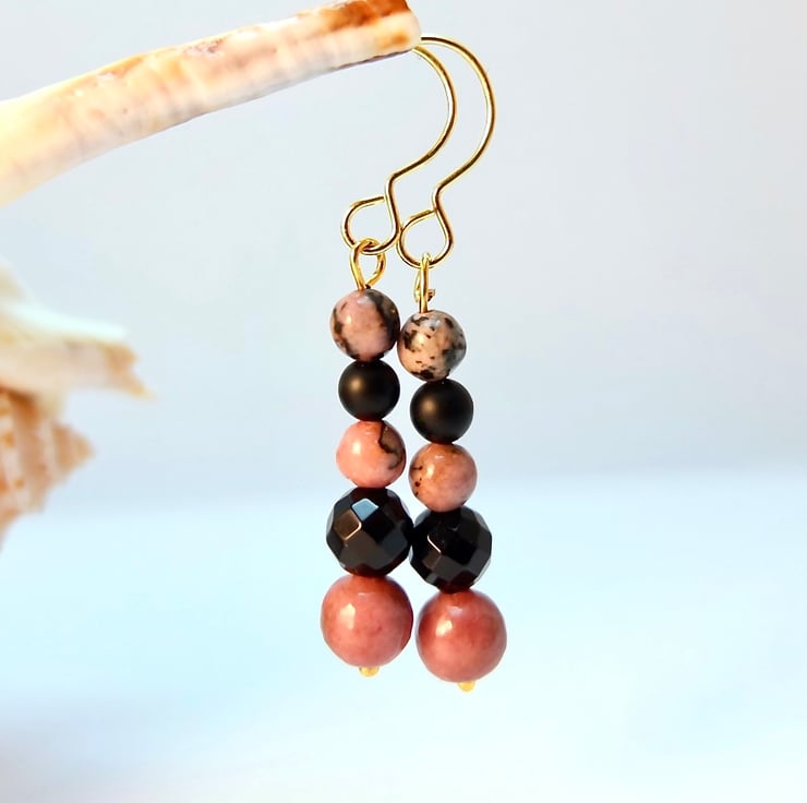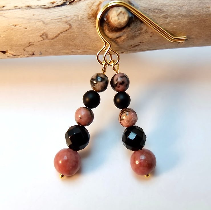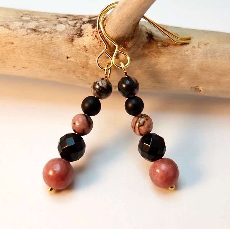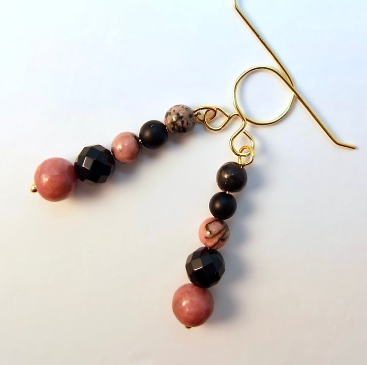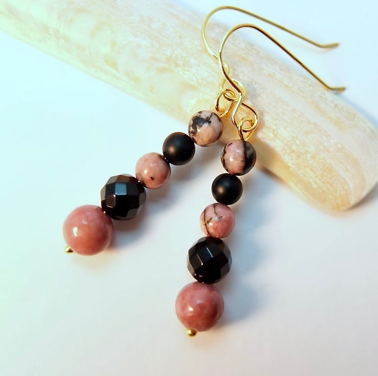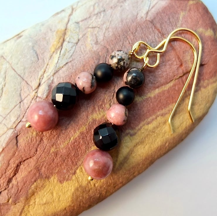 The 6mm and 4mm black-veined Rhodonite beads are varying shades of dusky pink shot through with black markings, the 6mm faceted black Onyx bead adds a subtle glint while the 4mm frosted black onyx emphasises the patterns in the Rhodonite.