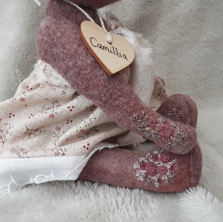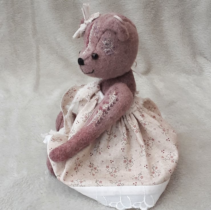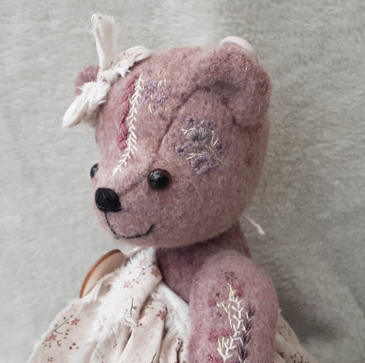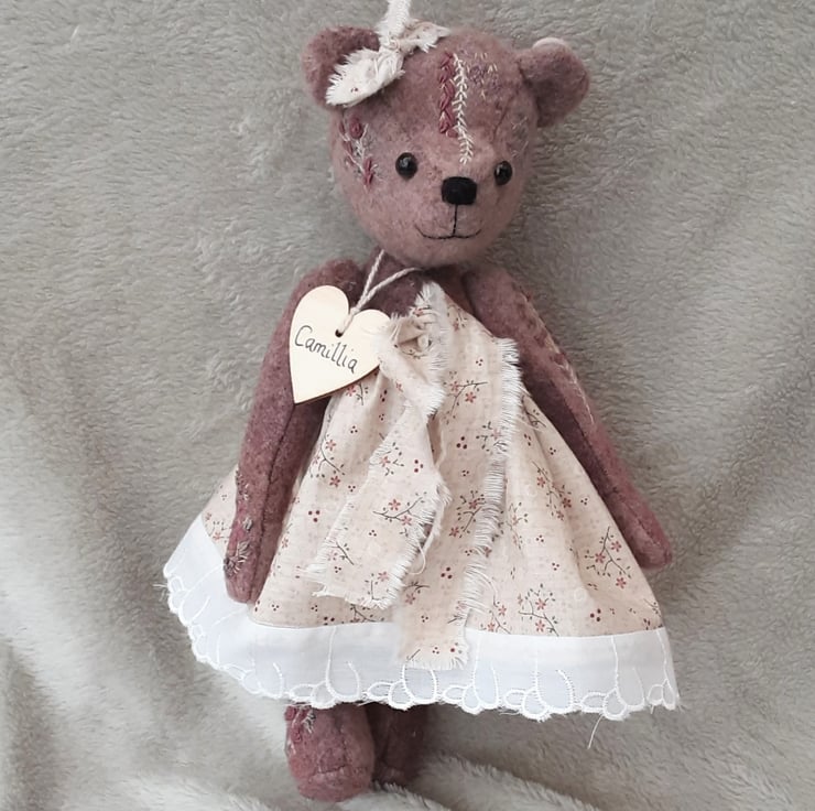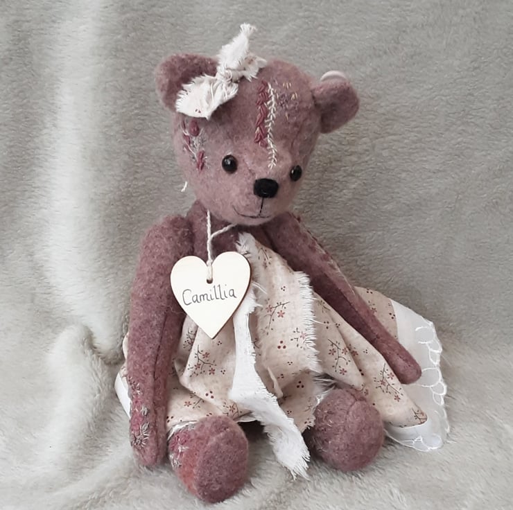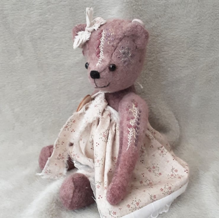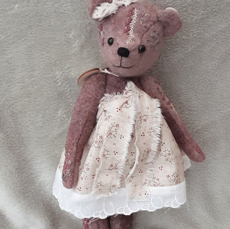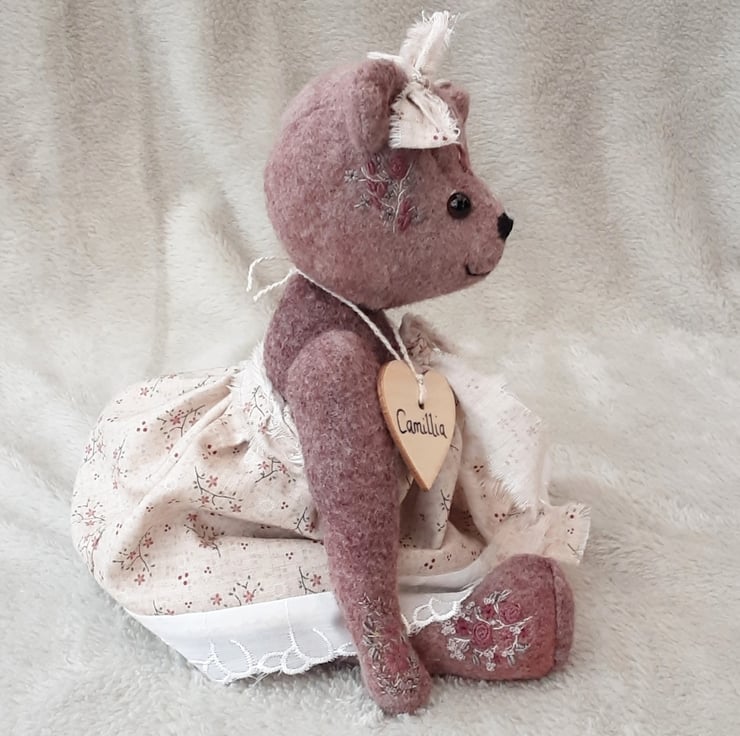 Meet Camillia, a beautifully elegant hand dyed bear. She has floral hand embroidery to her body pieces in pinks and plums to match the hand dyed alpaca fabric she was created from. A lovely warm coloured fabric with various tones and shades throughout, she is a one off creation.