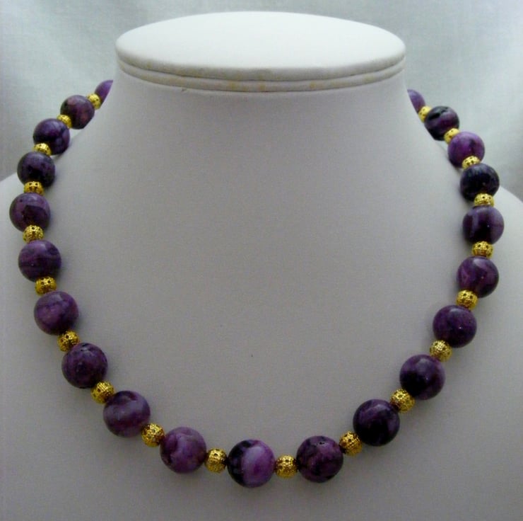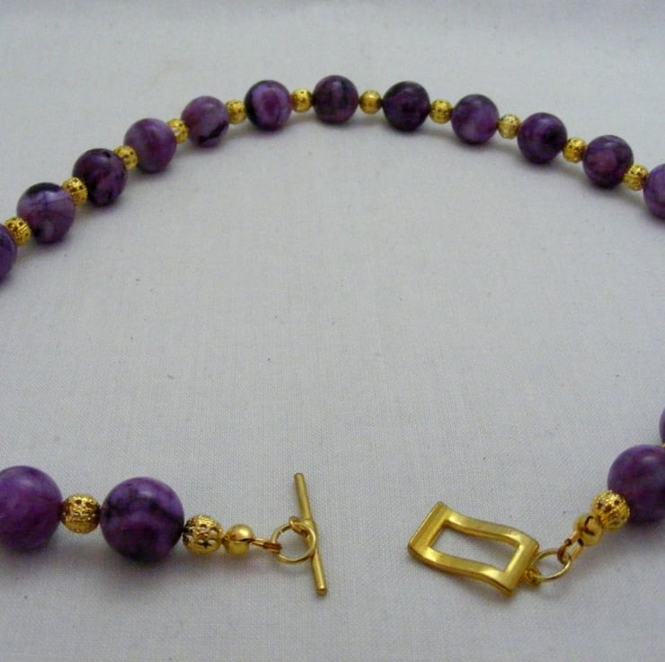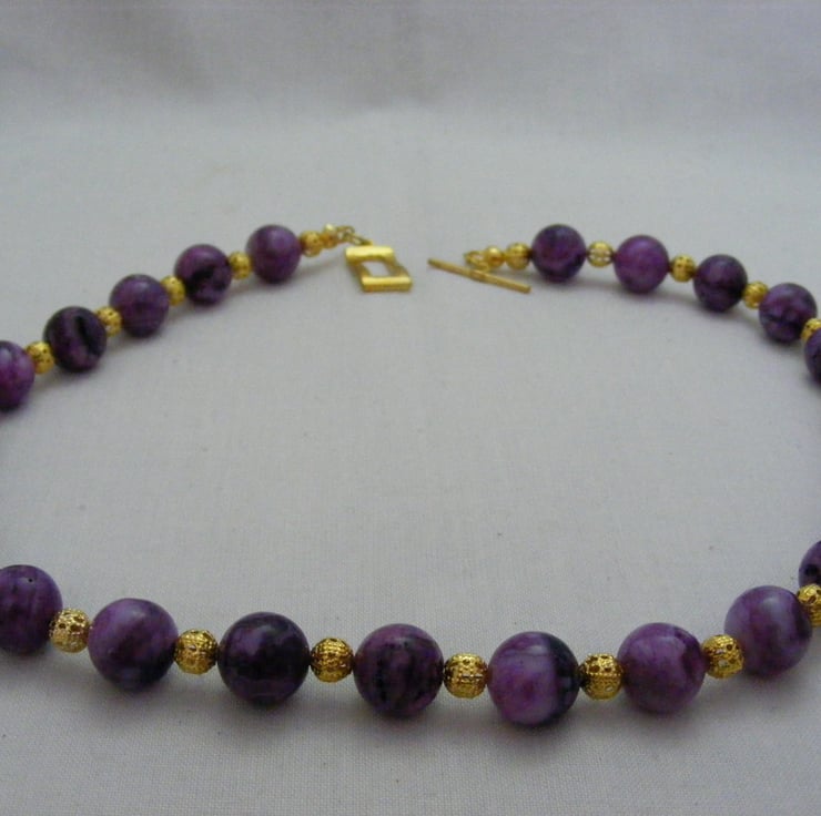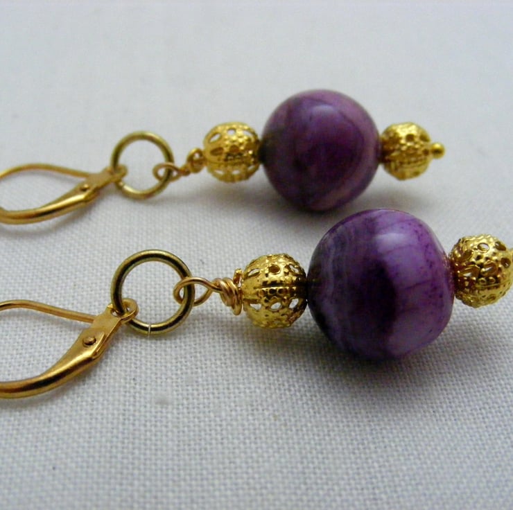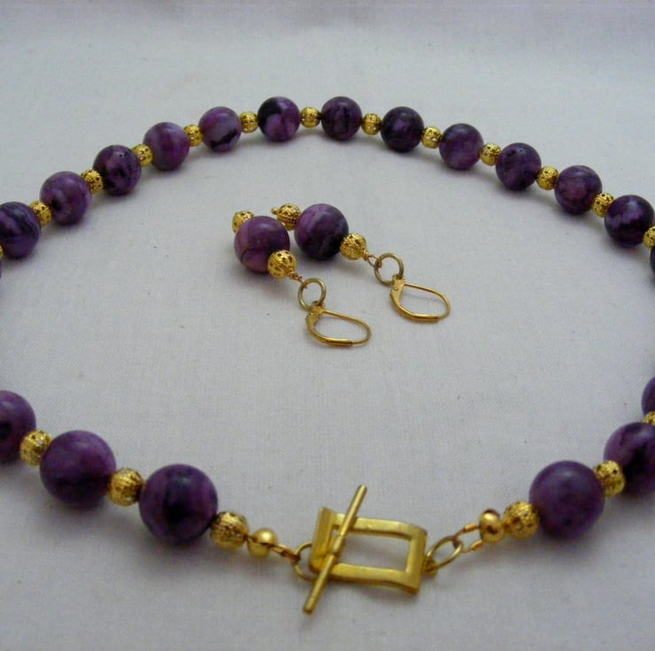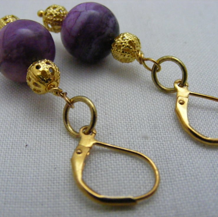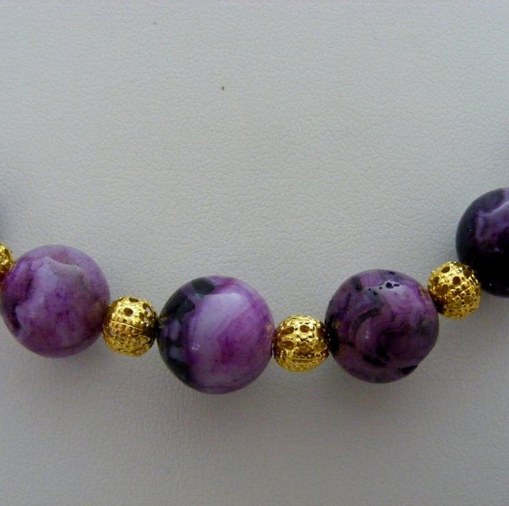 This beautiful gemstone jewellery set includes a necklace with matching earrings. Set is one of a kind, handmade with, 12mm purple crazy lace agate beads, 6mm gold plated filigree spacers, gold plated findings, gold plated toggle clasp for the necklace and gold plated lever backs for the earrings.