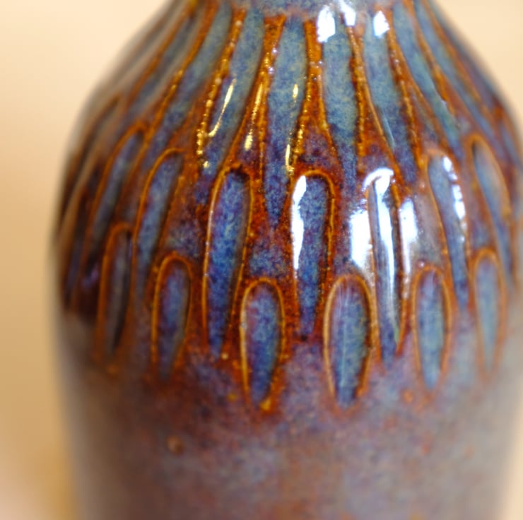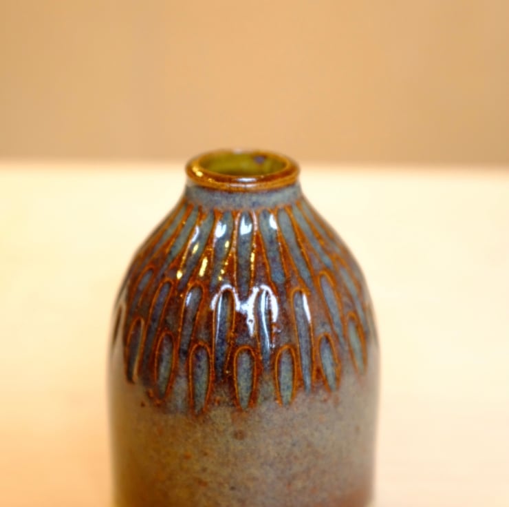 Hand thrown, stoneware, bottle-shaped bud vase with carved pattern.