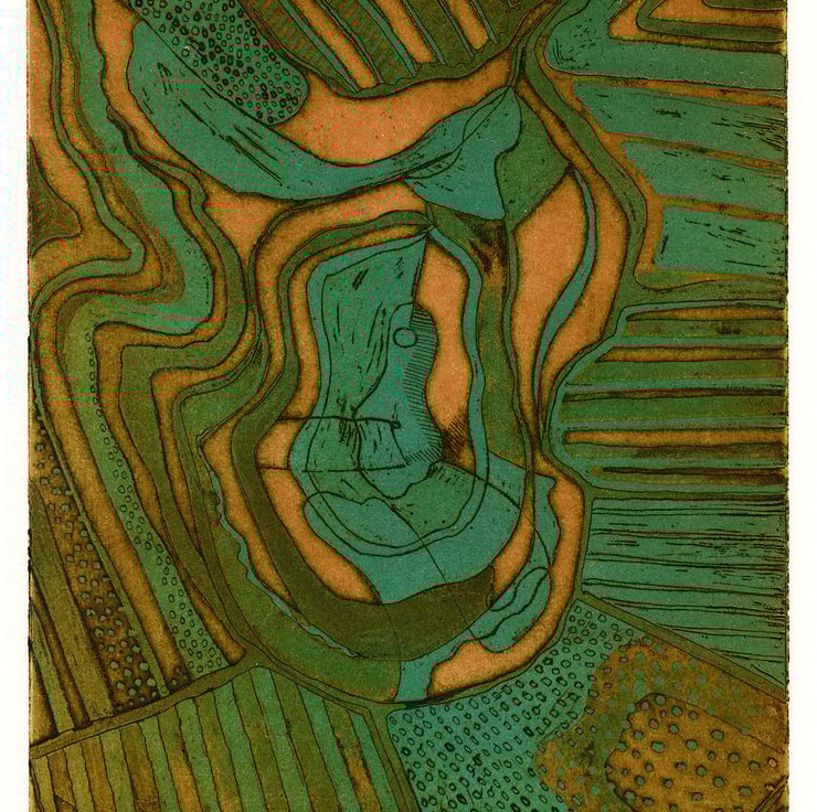 It is equally interesting to look down on via aerial views & the topography of an ordnance survey map. I made many drawings of the area & this one leant itself to a more abstract design which I turned into an etching.