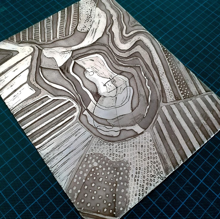 The abstract design of this coloured etching, is inspired by aerial views & maps. The image looks down onto an iron age hillfort with rings of earthworks & a round barrow at its centre.