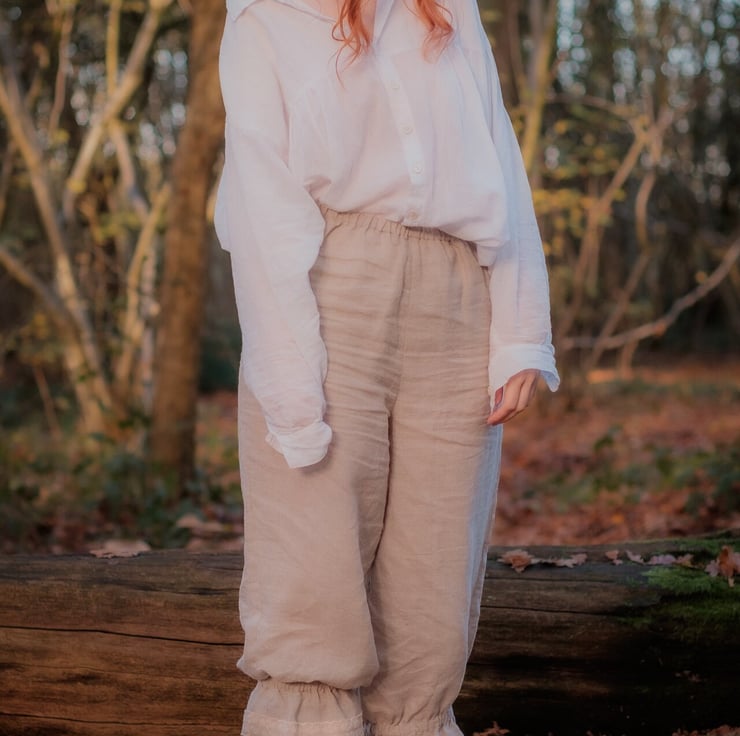 Loose fitting with an elasticated waist and cute linen embroidery anglaise trim. You have a choice of either elasticated cuffs or tie ribbon cuffs.