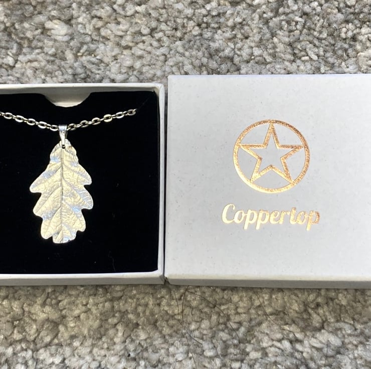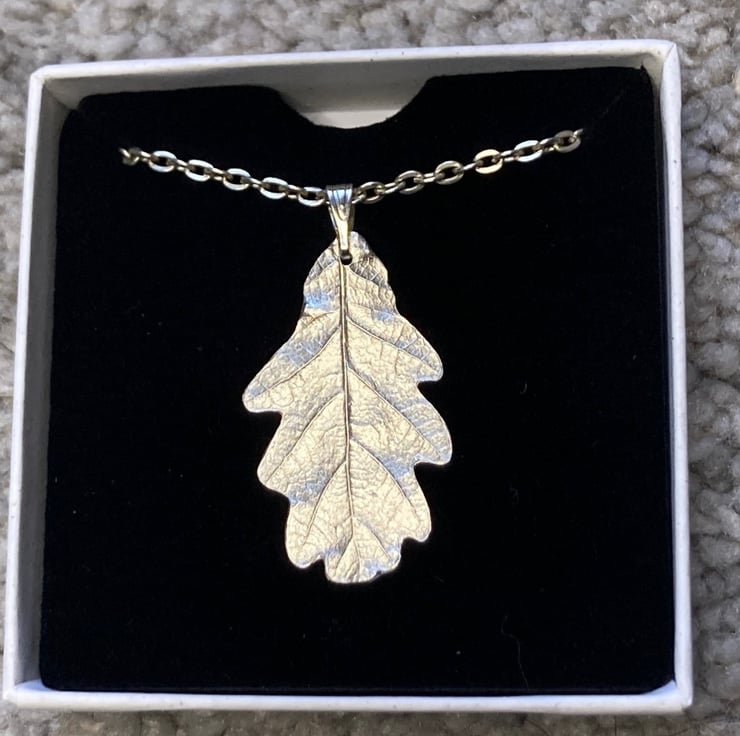Handmade Fine silver oak leaf. Designed from a real leaf gathered on my dog-walking travels. I love taking inspiration for my jewellery from the natural world. The leaf is made from precious metal clay which is recycled silver that produces a 999 fine silver piece of jewellery. All lovingly handmade and unique and so mild variation may occur from product picture. Jewellery is delicate and will tarnish with time and wear. Clean carefully with a silver cloth. Chain length 18 inches. Pendant measures 3.5 x 2cm.