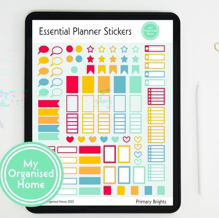 This is a set of 95 individual digital stickers in the Primary Brights colourway for use with digital planners. The digital download includes a PNG file for each sticker element supplied in a zip folder as well as a complete PNG showing all the stickers, a set of instructions in PDF format and a GoodNotes sticker book file containing cropped stickers for instant use.