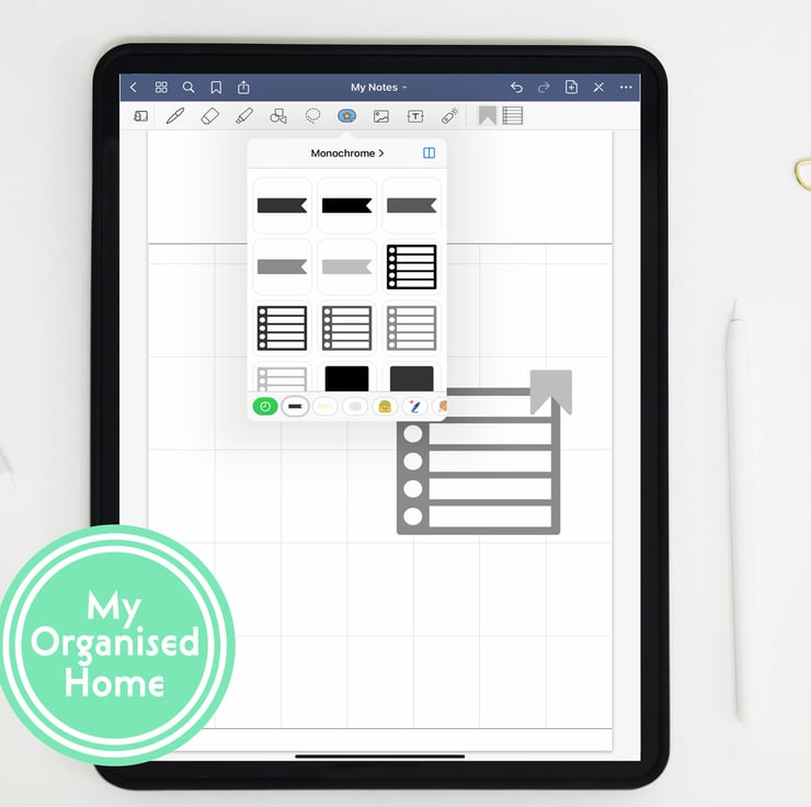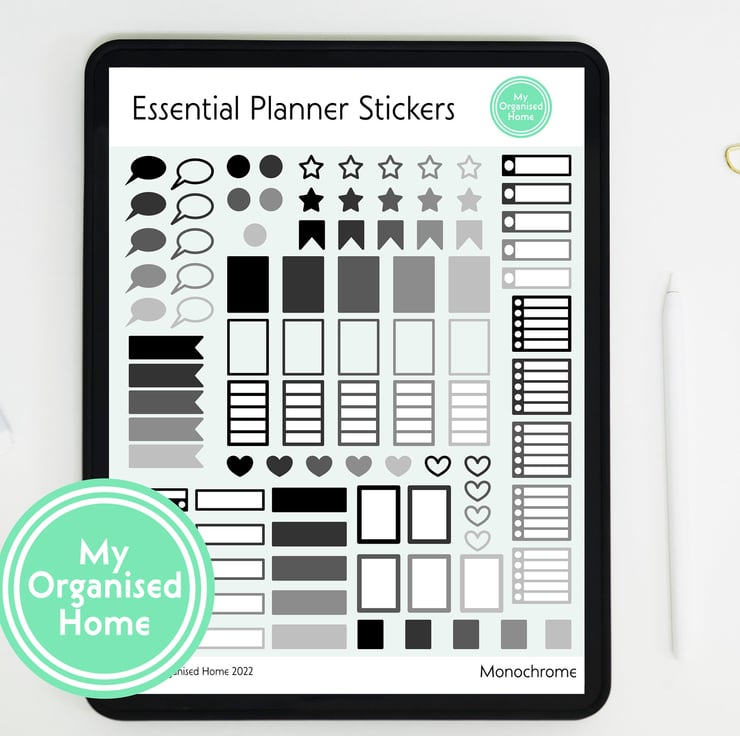 This is a set of 95 individual digital stickers in the Monochrome colourway for use with digital planners. The digital download includes a PNG file for each sticker element supplied in a zip folder as well as a complete PNG showing all the stickers, a set of instructions in PDF format and a GoodNotes sticker book file containing cropped stickers for instant use.