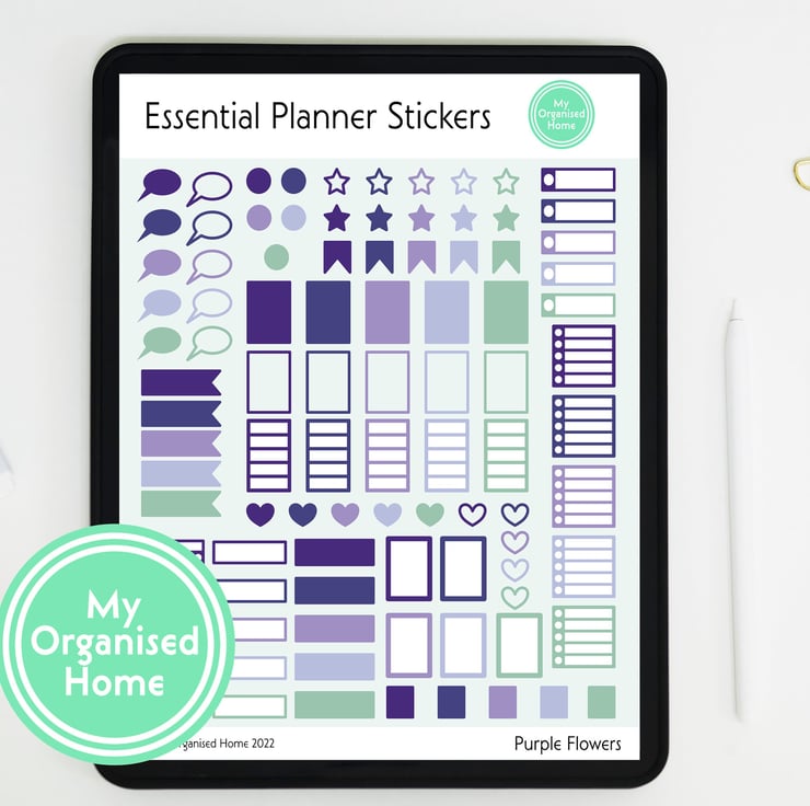 This is a set of 95 individual digital stickers in the Purple Flowers colourway for use with digital planners. The digital download includes a PNG file for each sticker element supplied in a zip folder as well as a complete PNG showing all the stickers, a set of instructions in PDF format and a GoodNotes sticker book file containing cropped stickers for instant use.