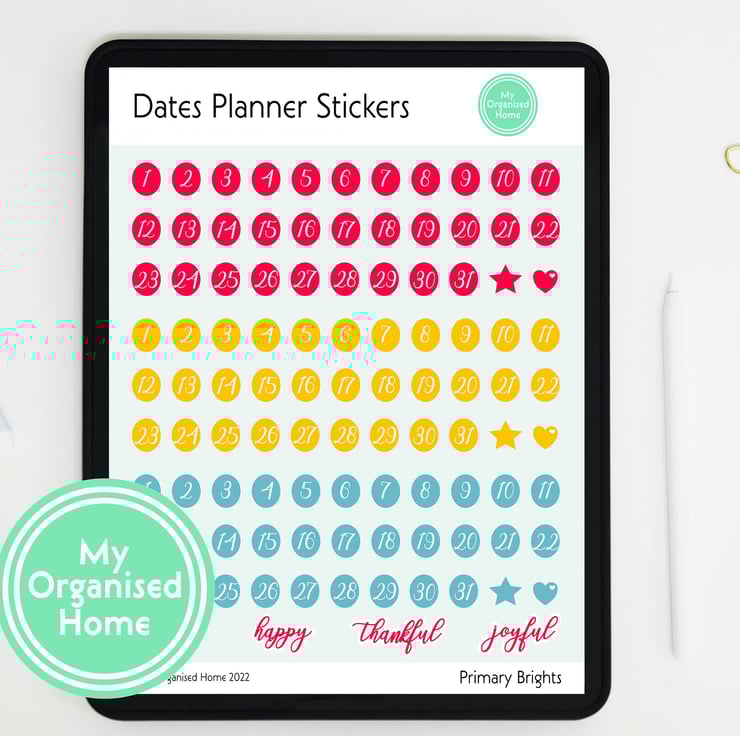 This is a set of 103 individual digital stickers in the Primary Brights colourway for use with digital planners. The digital download includes a PNG file for each sticker element supplied in a zip folder as well as a complete PNG showing all the stickers, a set of instructions in PDF format and a GoodNotes Elements sticker file containing cropped stickers for instant use.