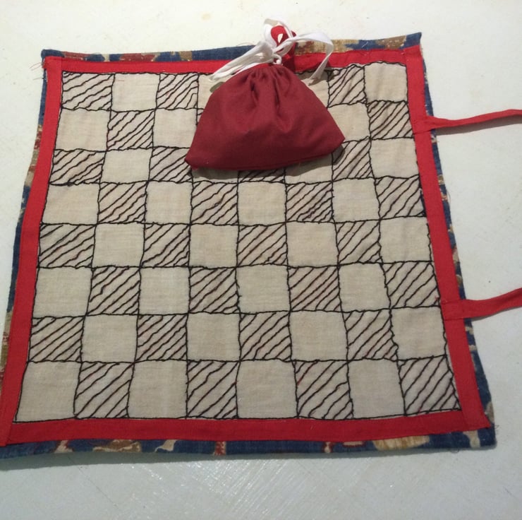 I created this embroidered cotton draughtboard by infilling the darker squares with stitching. I then gave it a red cotton border. The backing fabric is a rich, textured cotton. I made a red cotton bag to contain the wooden pieces and instructions.