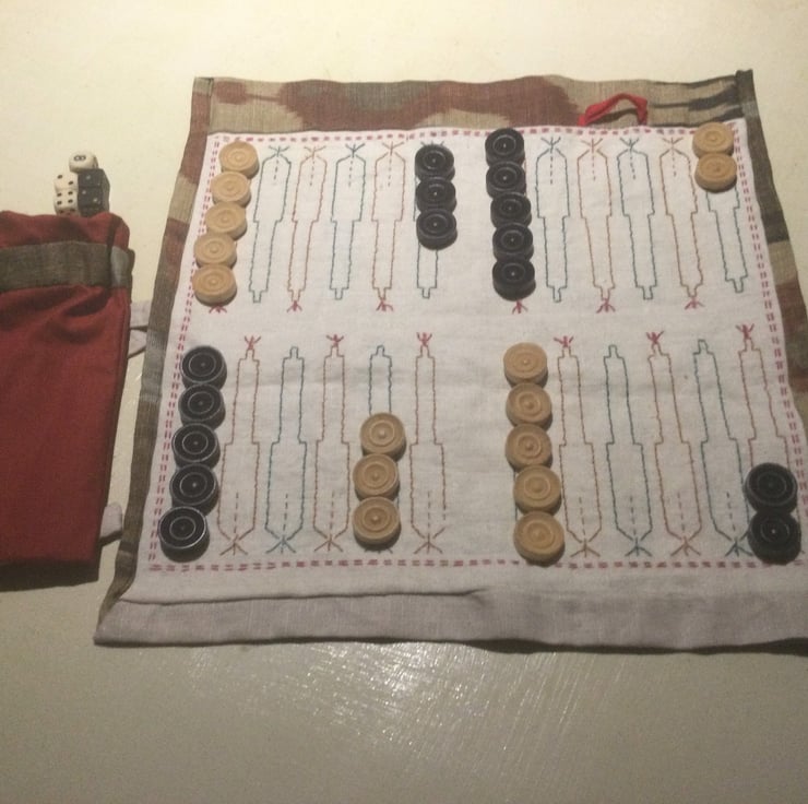 My linen backgammon game would make an unusual gift for any one over the age of 8. I could personalise the game by embroidering a name on the bag. I would charge 5 extra for this.