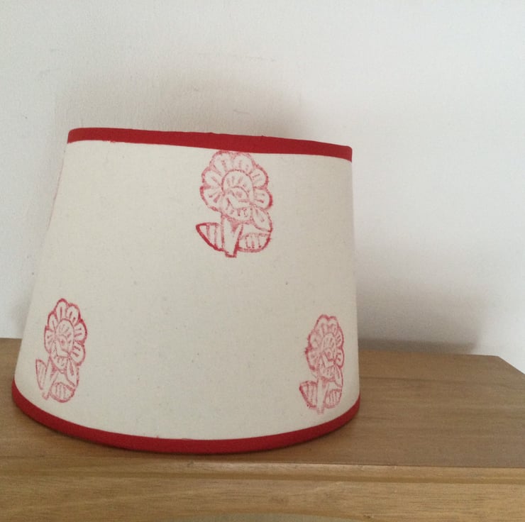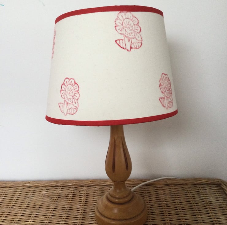 I used an Indian wood block to print the design in red on natural calico.I then made the shade and gave it a coordinating red trim.
