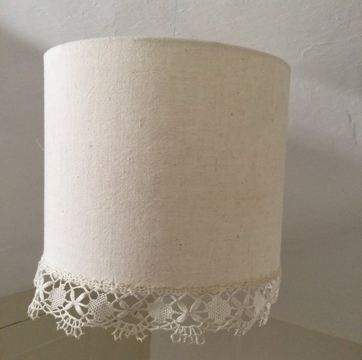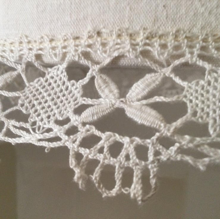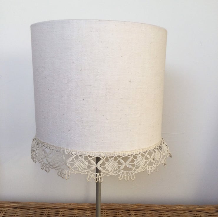 I made this drum shade from vintage linen I found in a brocante sale in the South of France. The handmade lace I found locally in Gloucestershire.