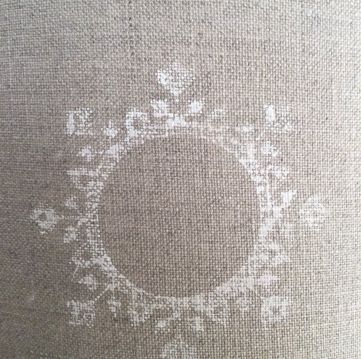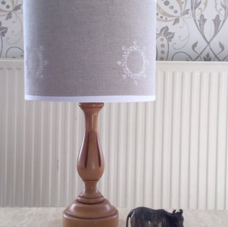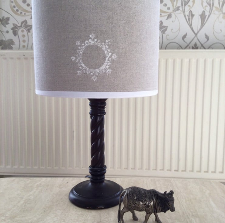 I printed this drum lampshade with an Indian woodblock. The design is in white, on oatmeal-coloured linen and I gave it a white cotton edging. This natural colour works with both grey and brown spectra, modern and classic interiors.
