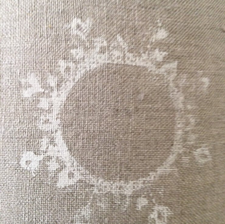 I made this ceiling hung shade by printing linen with an Indian woodblock. I then made up the shade. The linen is a pleasant oatmeal colour which makes it work in both grey and brown interiors.
