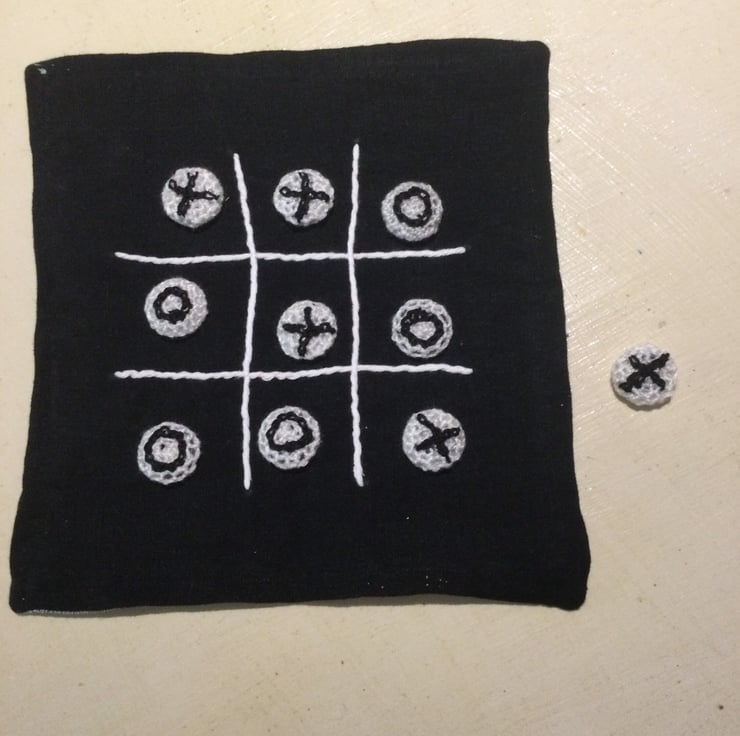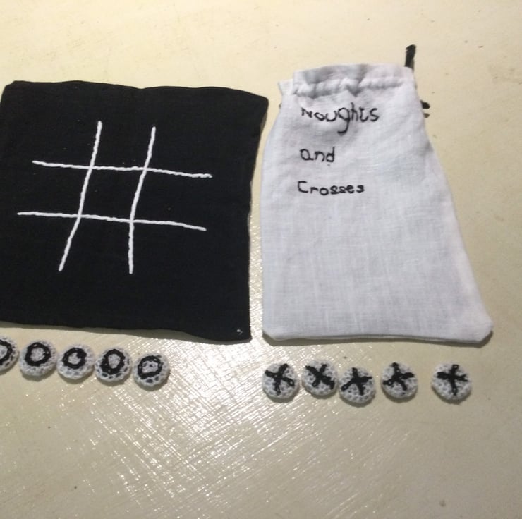 I made this textile noughts and crosses game with crocheted covered counters and stitched lettering. The board face and bag are made from linen . Both are lined and decorated with simple embroidery.