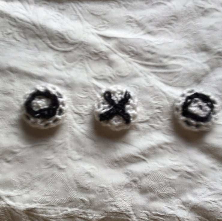 Found I could cover counters with crocheted cotton to make them more tactile and colour coordinated to my fabric. Voila a black and white noughts and crosses game!