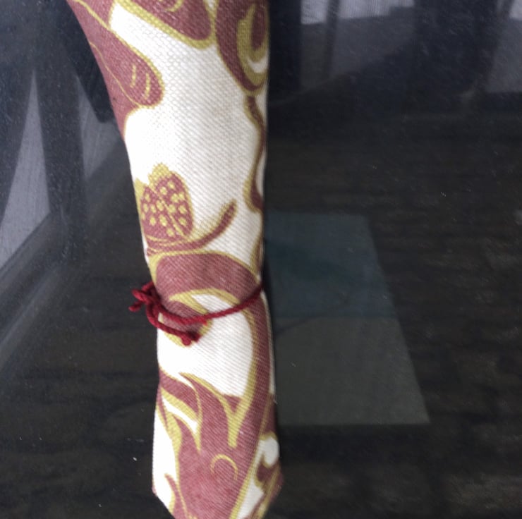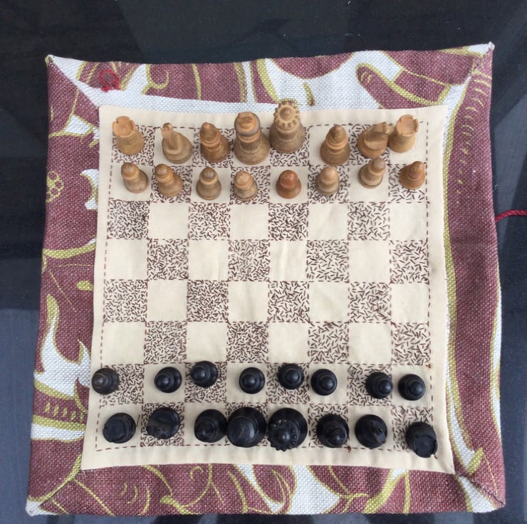 I made this chess game by embroidering the darker squares in seed stitch. Here I used a heavy cotton, Lewis and Wood fabric for the backing and bag. The bag contains the wooden playing pieces and can be tied to a loop at the top of the board, before being rolled up and tied with the wine coloured cord for easy carrying and storage. It comes with instructions.