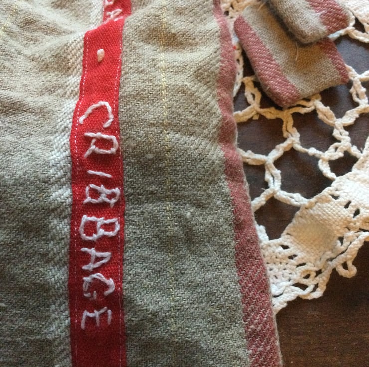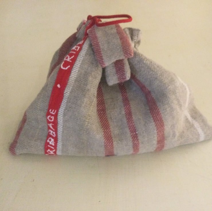 I made and embroidered the lined, linen bag for Cribbage . The linen is a thick but soft. It has attractive red and white stripes. The bag is lined in a checked red and white cotton fabric, and closed by a red cord drawstring .
