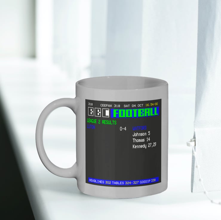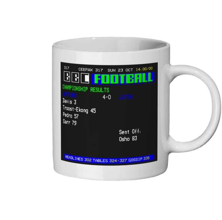 A beautiful 11oz sublimated ceramic retro mug celebrating the two dramatic 4-0 wins by Watford over Luton in 1997 and 2022 in league competition, using the medium of Ceefax.