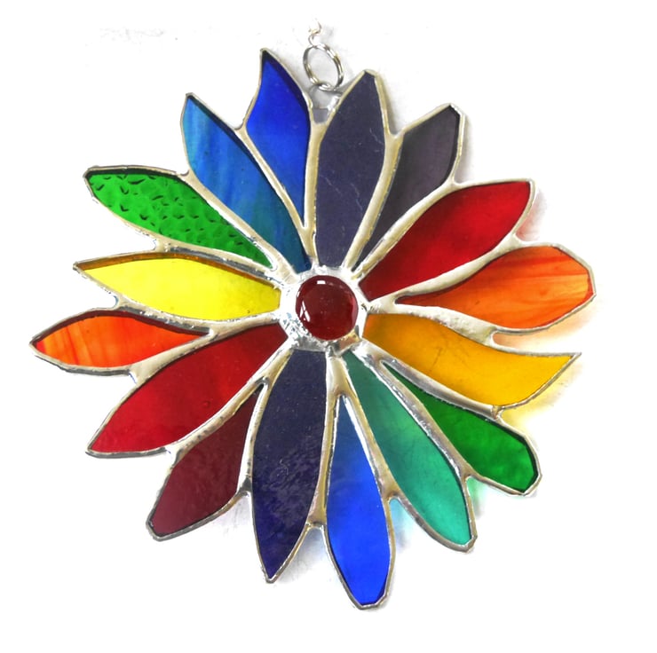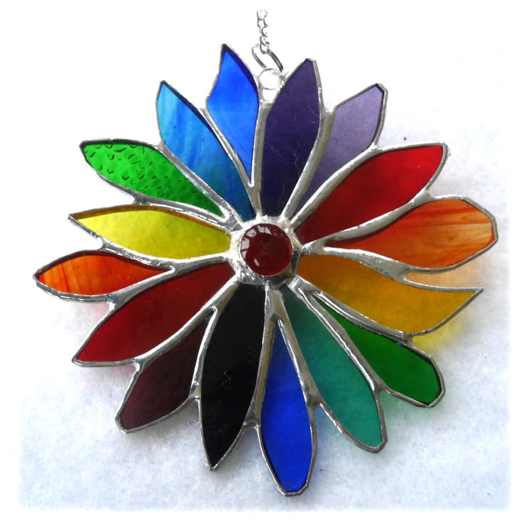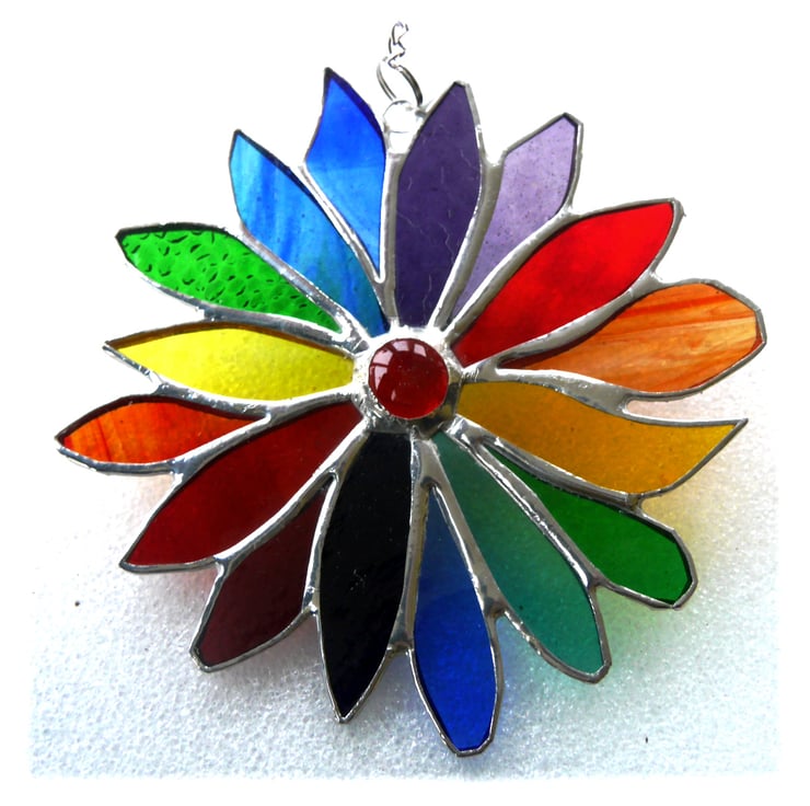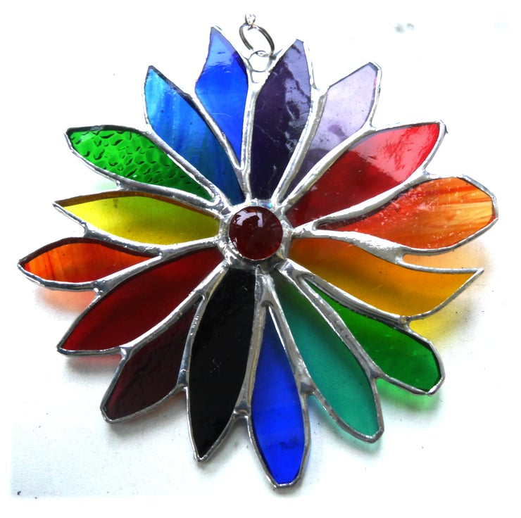 The flower has 16 petals, all slightly different shapes and the colours pass through the spectrum of the rainbow, twice. In the centre is a bright red glass nugget.