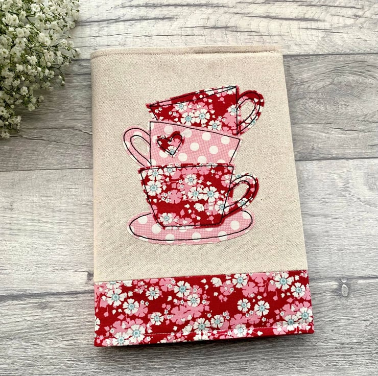 An a5 fabric notebook with a tea cup stack applique design in pink polka dot & red floral fabrics, a cute gift idea for a tea lover. Plus the cover is reusable.