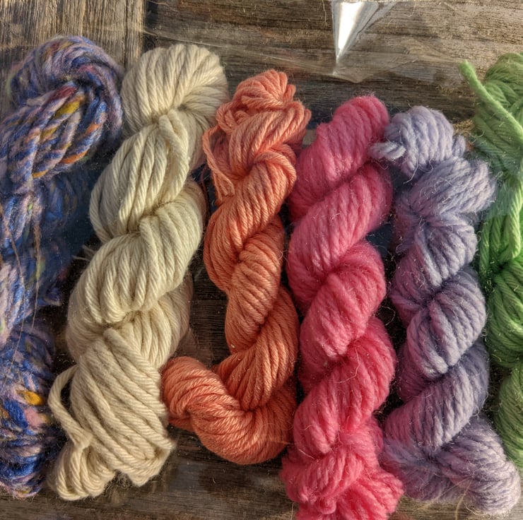 Various yarns and fibres in lovely colour combinations, to create the weft, which include a mixture of materials from the following